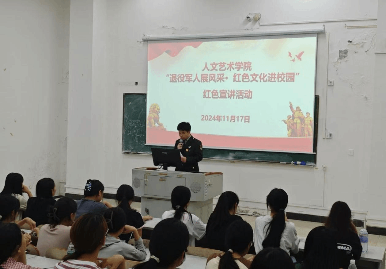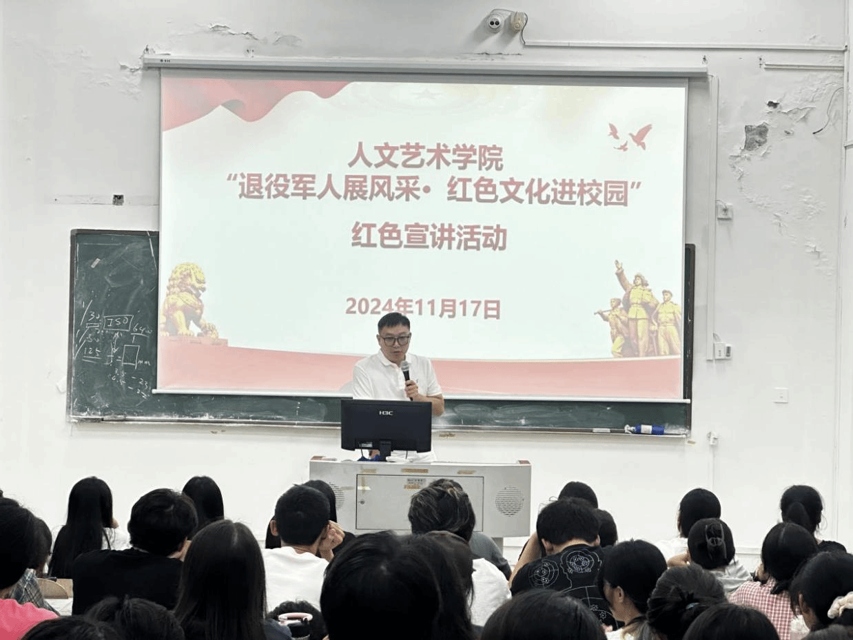 根据校学生工作处(部)的工作安排,深入实施时代新人铸魂工程,运用传承好红色基因,教育引导广大学生增强践行“两个维护”的高度自觉,在学院党总支的工作指导下,太阳集团tyc5997于11月17日晚在第一教学楼509教室开展“退役军人展风采·红色文化进校园”红色宣讲活动,现场共有150余名2024级同学参加,由学院学工办徐超老师主持。
