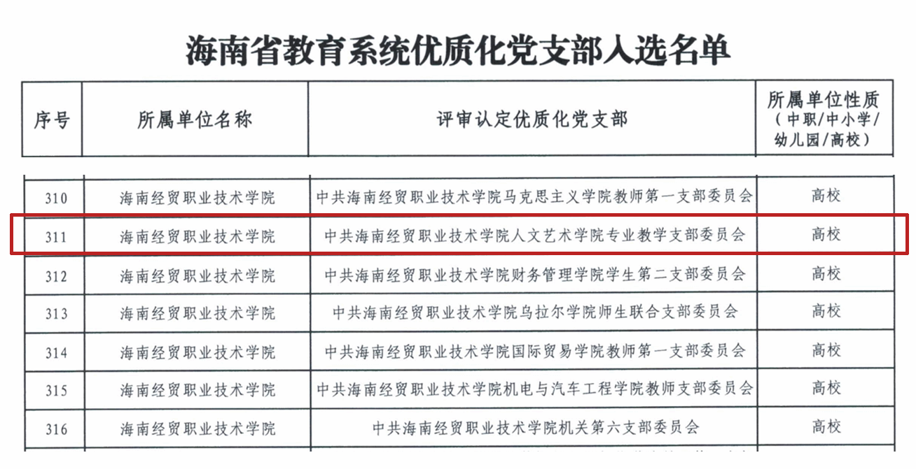 近日,中共海南省委教育工作委员会正式公布了全省教育系统优质化党支部入选名单,海南经贸职业技术学院收获佳绩,共有7个党支部成功入选,其中太阳集团tyc5997专业教学党支部榜上有名,此外还包括马克思主义学院教师第一党支部、财务管理学院学生第二党支部、乌拉尔学院师生联合党支部、国际贸易学院教师第一党支部、机电与汽车工程学院教师党支部以及机关第六党支部。