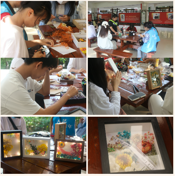 活动过程中,志愿者们向参与者详细地介绍制作干花相框的过程以及材料的使用方法,鼓励参与者发挥想象力。小小的相框展现了美好寓意,参与者们通过制作干花相框,结合自己的专业技能,提高了自己的实践能力和协调能力,从而更好地磨炼自己的专业技能。