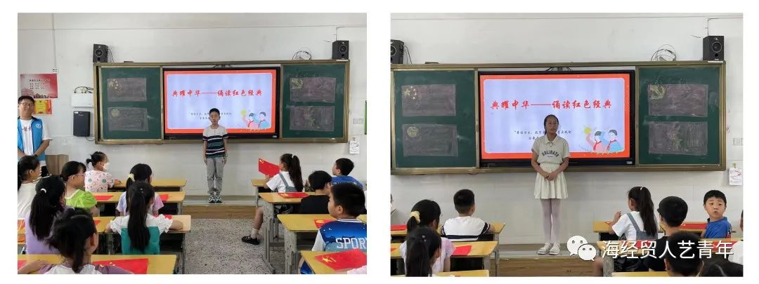 开展“典耀中华”诵读比赛。指导他们调整语音语调并大胆展示,品味中华传统经典文化中的文化精髓,培养他们对中华文化的热爱,增强文化自信,也有助于学生感悟中华文化的“美”;进行经典诵读推普教学,讲解红色经典故事,带领小朋友们朗诵红色诗词,激发儿童的民族自豪感和历史责任感,比赛场上传出的阵阵诵读声时而激昂,时而低沉,时而抑扬,但都饱含激情,展现了选手们蓬勃的青春力量。