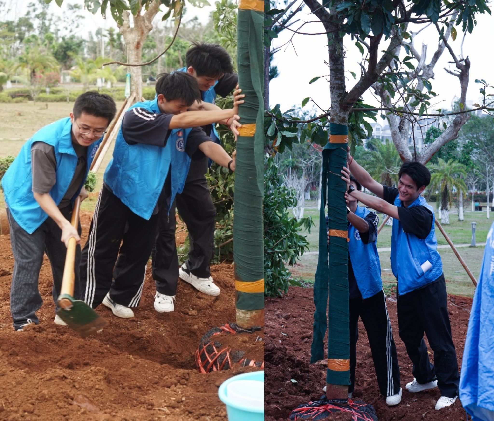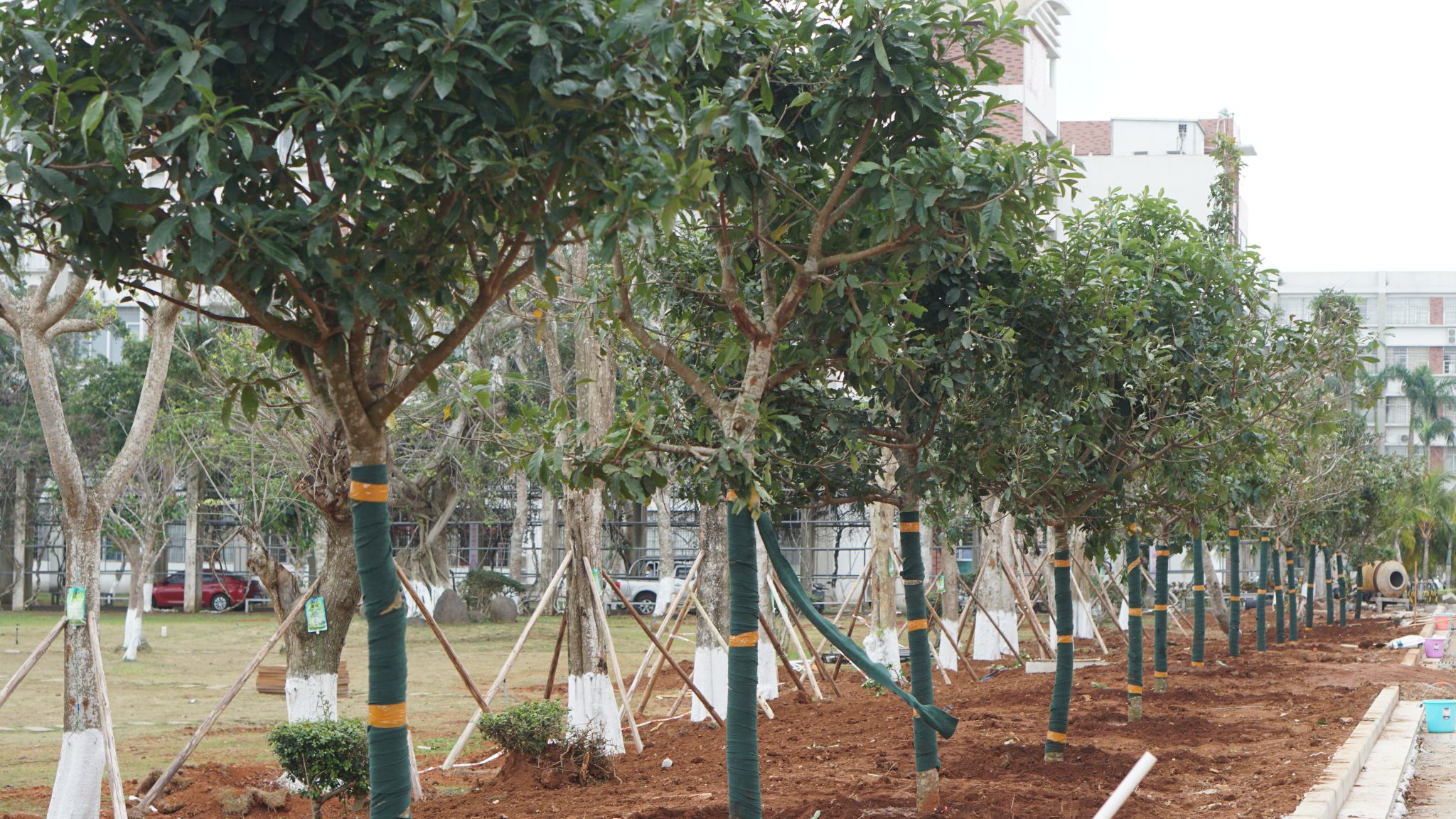 在大家共同努力下,一棵棵树苗扎根沃土,在和煦的春风中焕发出勃勃生机,新栽种的树苗错落有致,在明媚的阳光下展现出一片新绿,为校园增添了一片绿意与生机。