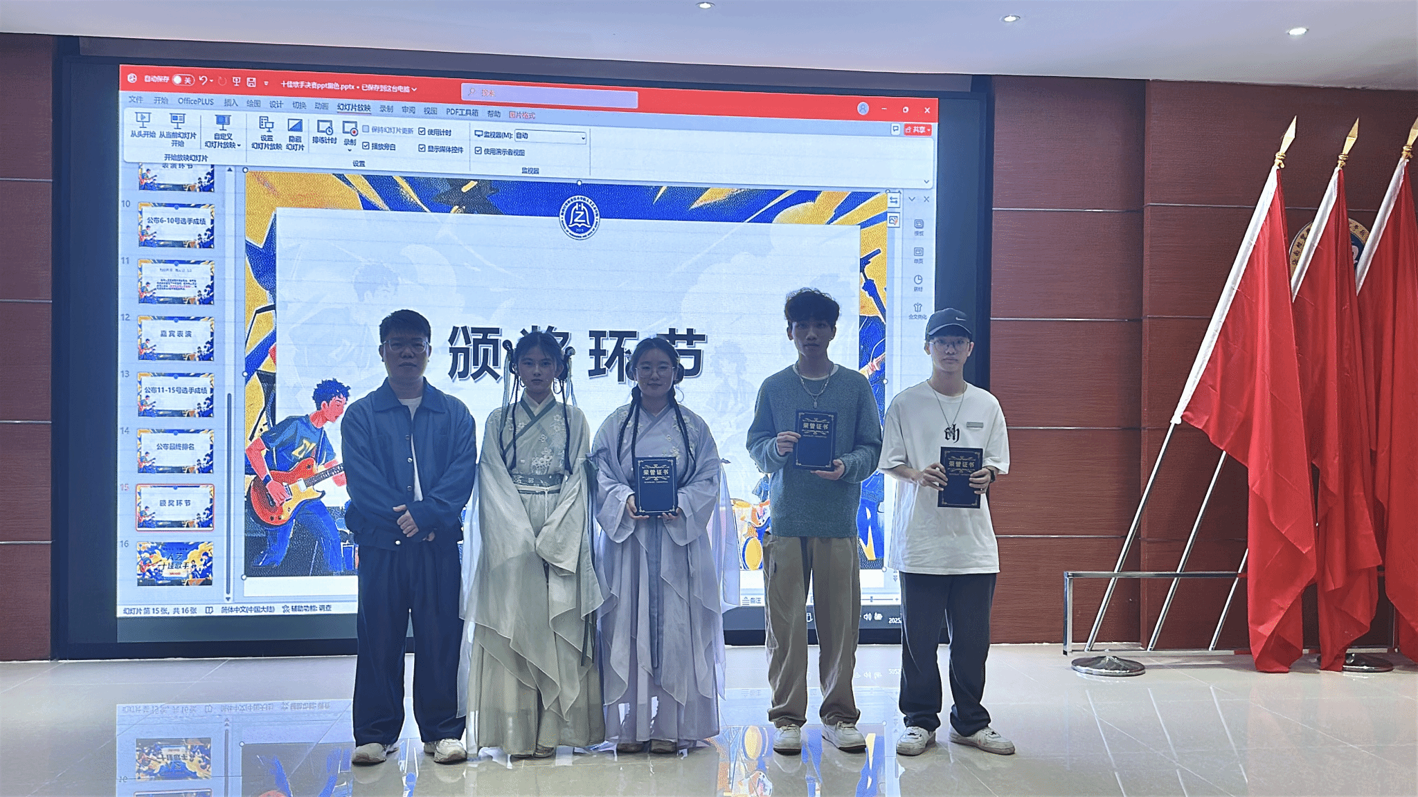 经过激烈角逐,最终,22环艺(高本3+2)1班许丝、23文创2班刘夏欣与24室内2班李永靖组合、23景观1班谭志安同学分别荣获大赛冠亚季军;23服装1班康志涛、23品牌2班王世昌、23景观2班邱佳颖等7名同学分别荣获第四至第十名;23室内2班张武燕与冉陈盈组合、24环艺(高本3+2)1班吴霞、23文创2班刘夏欣与24室内2班李永靖组合荣获最佳人气奖;24环艺(高本3+2)1班吴霞、23文创1班龚芯、23品牌1班王语慧与王思玟组合、23品牌2班彭业威、23品牌1班朱卓荣获最佳歌喉奖。