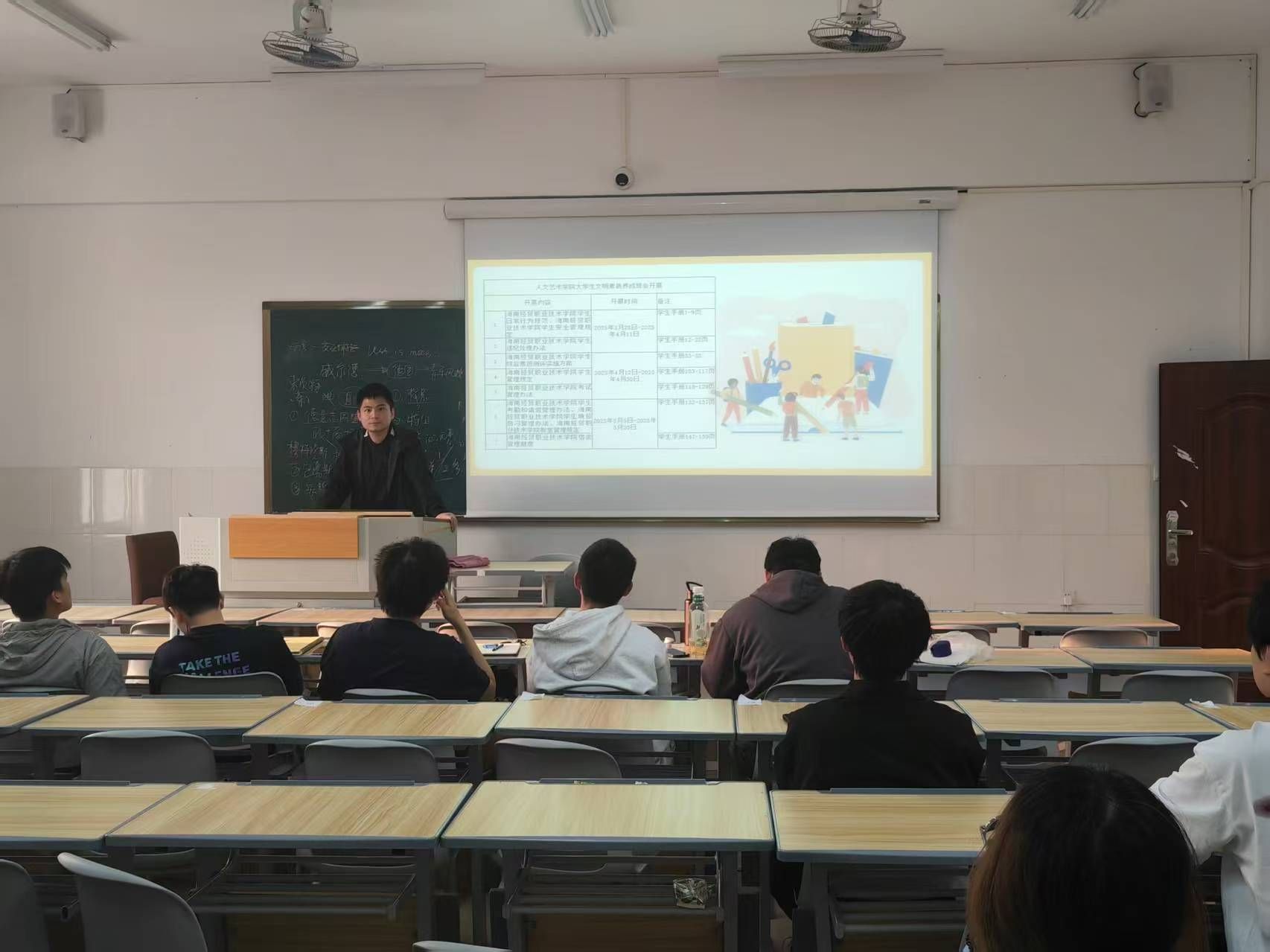 在班会上,各班主任根据学生手册里《海南经贸职业技术学院学生日常行为规范、海南经贸职业技术学院学生安全管理规定》、《海南经贸职业技术学院学生违纪处理办法》,对行为规范、安全管理规定及违纪处理办法进行了深入讲解,特别强调了校园文明行为规范的重要性,要严格日常纪律考勤,杜绝教学区域抽烟、晚归和夜不归宿、日常宿舍卫生不达标、宿舍使用违规电器、仪容仪表不规范(染夸张发色、穿奇装异服、穿拖鞋进出教学楼、随地乱扔垃圾、带饭进入教学区域、车辆乱停乱放)等举止不文明和违规违纪行为。