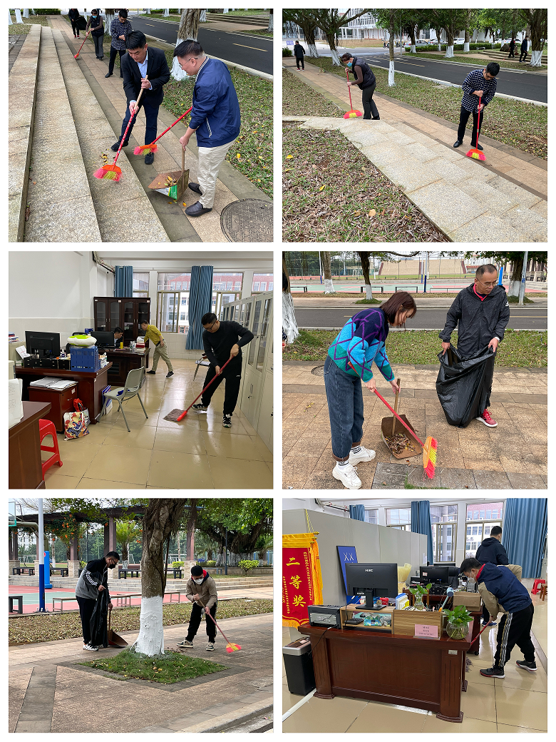 为建设干净整洁、优美舒适的校园环境,迎接新学期的到来,我院认真落实《关于开展2023年春季学期校园环境卫生大扫除的通知》文件精神。2月15日,太阳集团tyc5997党总支组织教职工对我院办公区域以及卫生责任区的主干道、绿化带等公共场所全面开展清理打扫和卫生清洁,为春季学期开学做好充分准备。