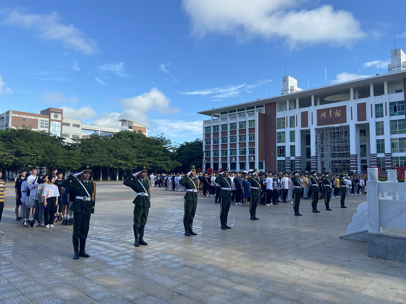 在整齐划一的脚步声中,升旗仪式正式开始。伴随着国歌声,五星红旗冉冉升起,全体师生面向国旗行注目礼。
