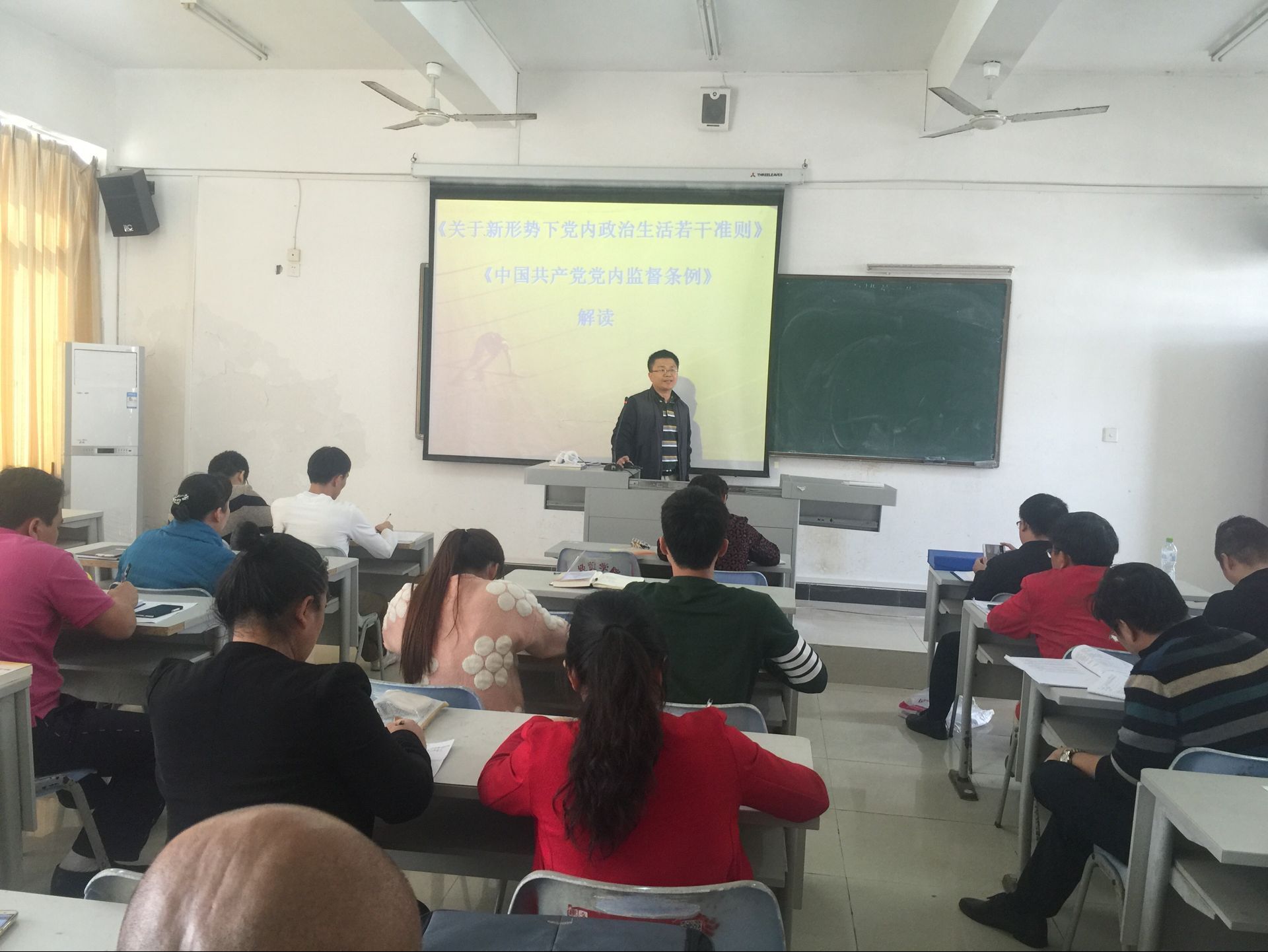 第二项议程是党课:由行政支部书记邓小康解读《关于新形势下党内政治生活的若干准则》、《中国共产党党内监督条例》等党内准则条例精神,邓书记带领大家对内容进行了集中学习,并做了详细的解读和指导,深入浅出的讲解让大家理清了认识,提醒各位党员同志牢记党规党纪,牢记党的优良传统和作风,树立崇高道德追求,养成纪律自觉,守住为人、做事的基准和底线。
