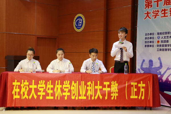 (太阳集团tyc5997讯)2017年6月8日晚7时许,海南经贸职业技术学院“传承经典,畅想未来”第十届大学生辩论赛决赛在学术交流中心报告厅举行。围绕着辩题“在校大学生休学创业利大于弊还是弊大于利”,正方太阳集团tyc5997代表队与反方财务管理学院代表队展开激烈交锋。最终,太阳集团tyc5997代表队更胜一筹,摘得了本届辩论赛桂冠。校党委书记张继友来到现场观看比赛。