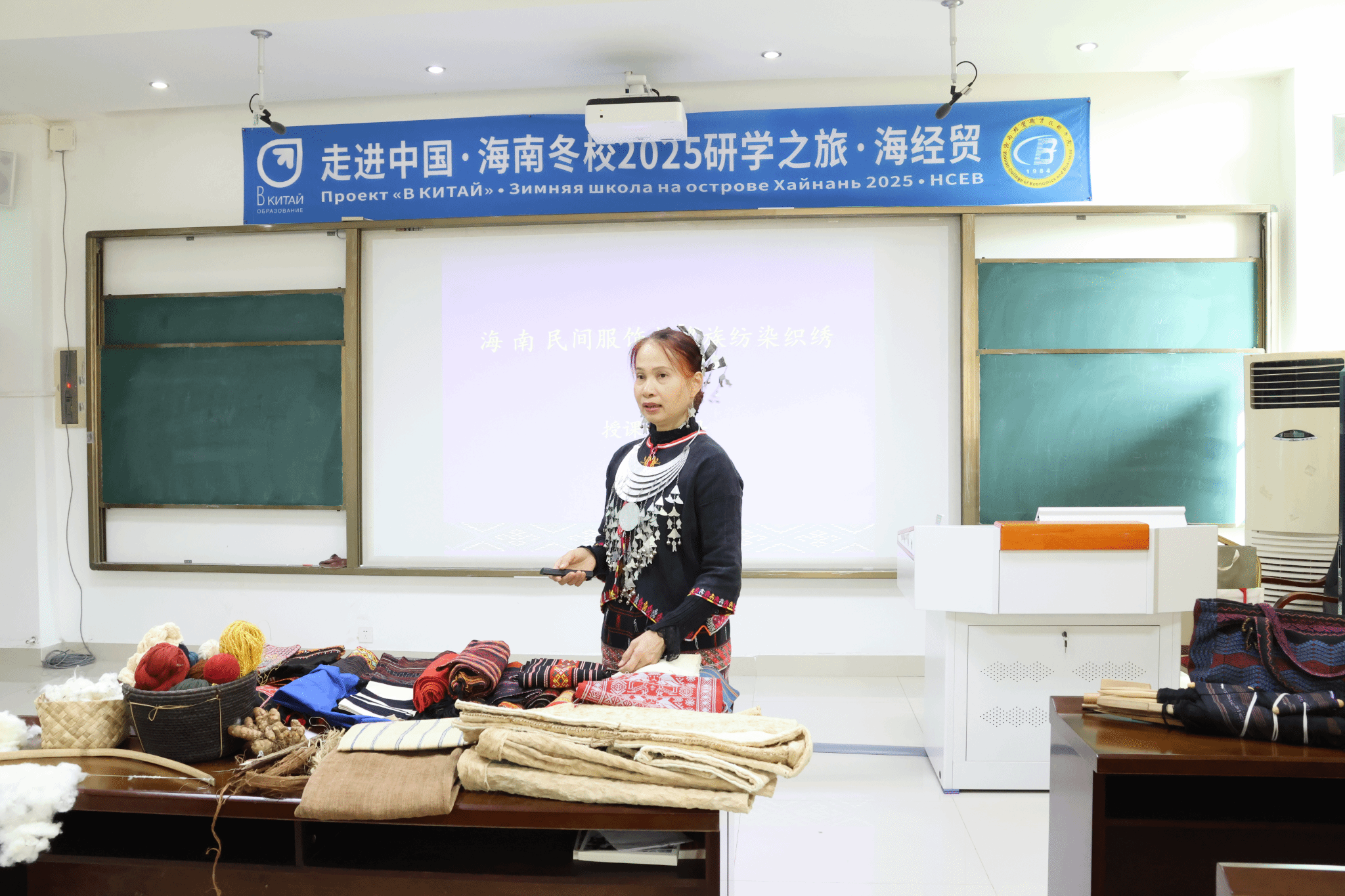 本次活动得到了海南省非物质文化传承人、南海工匠陈丹老师的鼎力支持。陈丹老师以其深厚的学识和精湛的技艺,向国际学员们全面介绍了非遗黎锦文化的丰富内涵。从黎锦的原材料选取、纺线、染色、织布、刺绣技艺,到树皮衣的制作、海南黎族五大方言服饰的特色、图案的寓意、龙被的传奇,陈丹老师娓娓道来,让国际学员们对黎锦文化有了更加深入的了解。