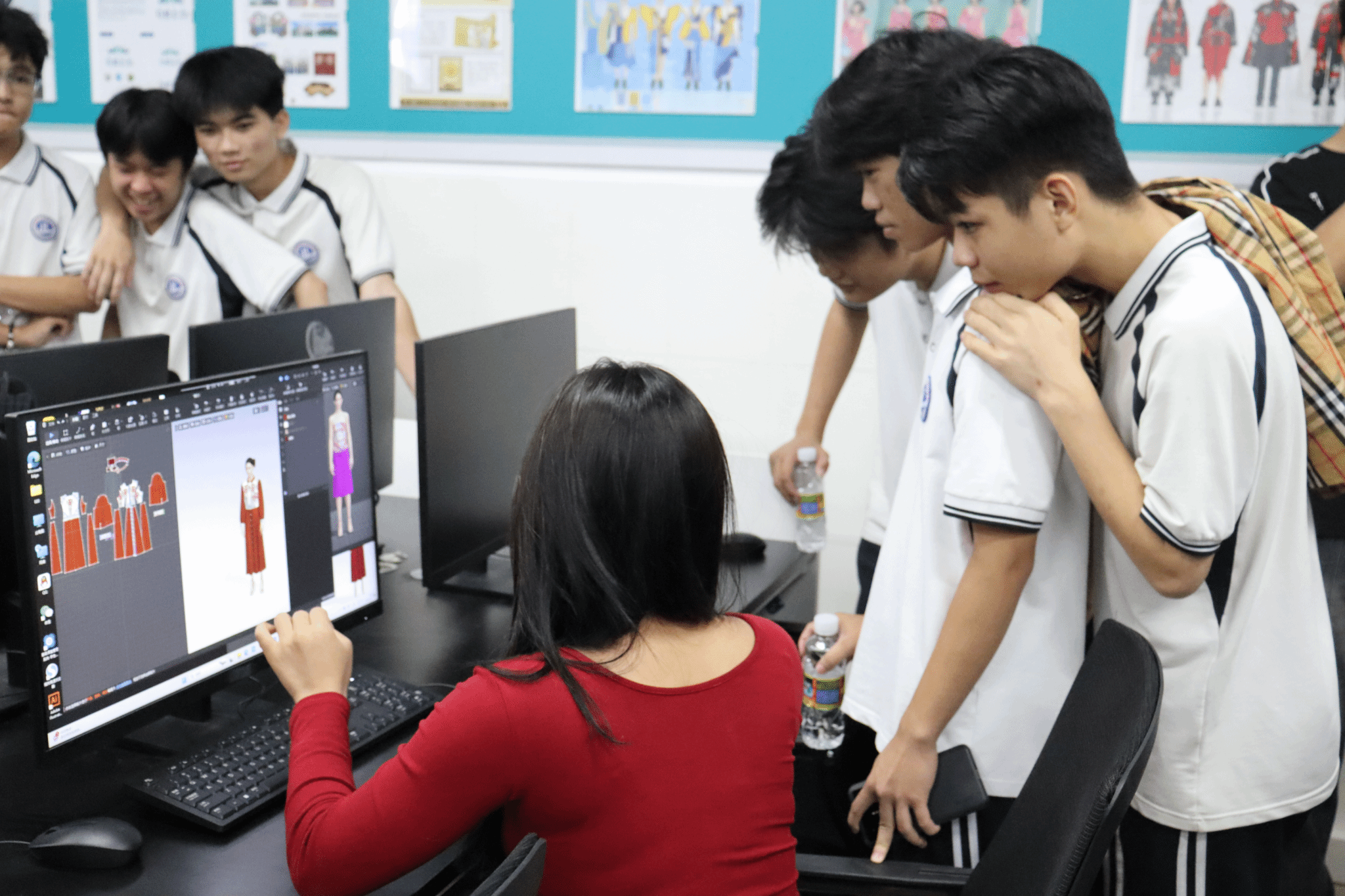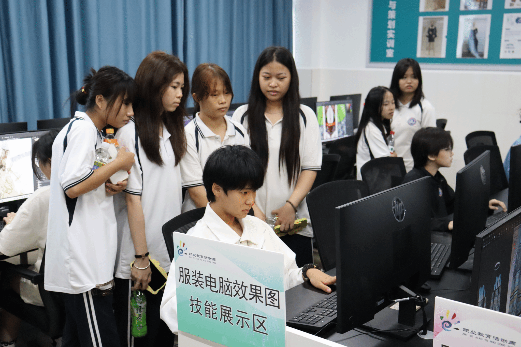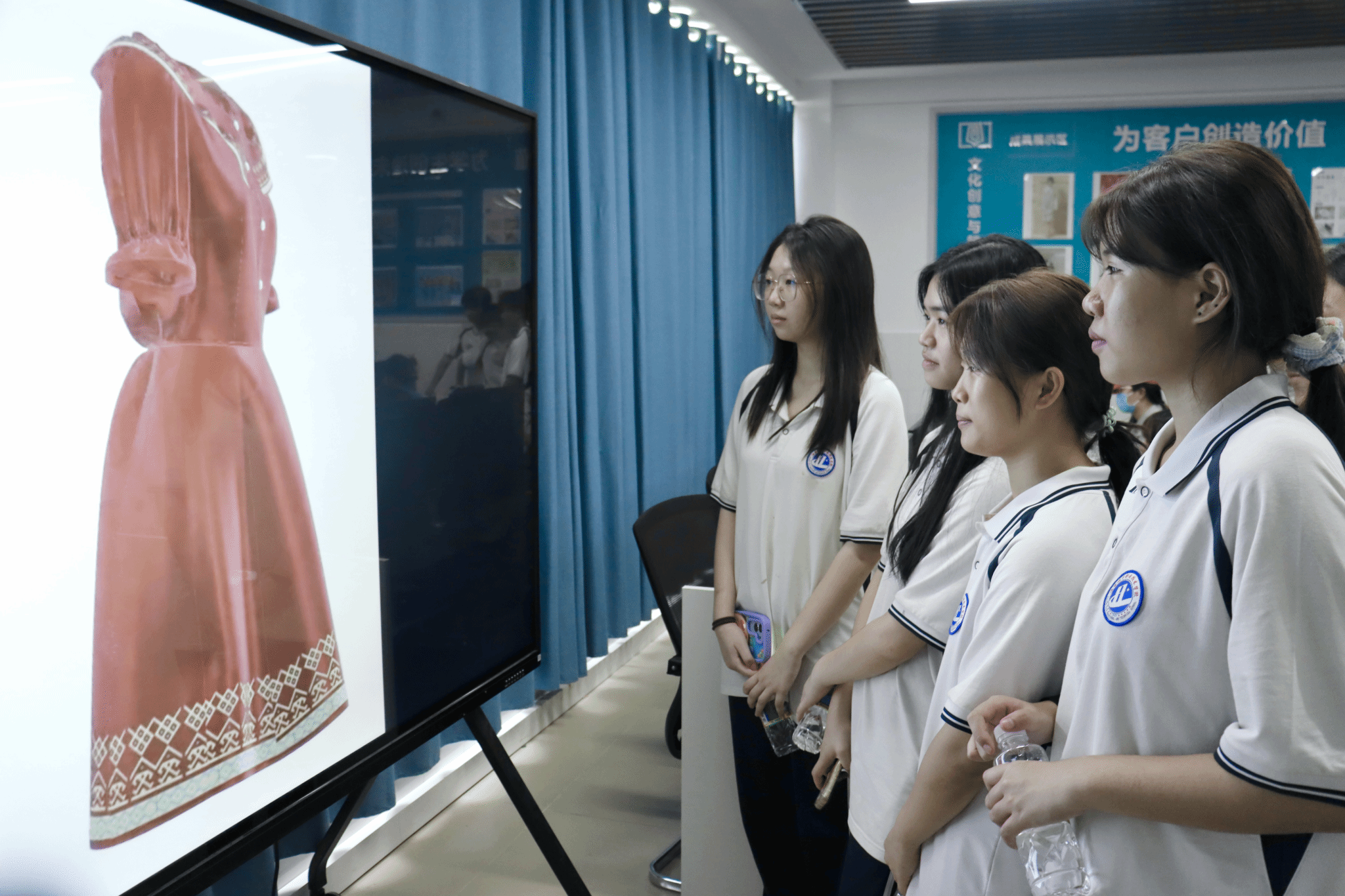 在时尚服装与饰品研发中心,师生们目睹了服装手绘效果图、CAD制版、纸样出图、服装裁剪、服装缝制工艺、服装立体裁剪、饰品制作、服装印花、黎锦双面绣、黎族织锦等专业技能的精湛展示,并与展示技能的同学进行了深入交流。服装陈列设计实训室和文化创意与策划实训室的服装陈列、服装电脑效果图、服装3D建模设计技能展示参观,更是让师生们对时尚产业的前沿技术有了更全面的了解。