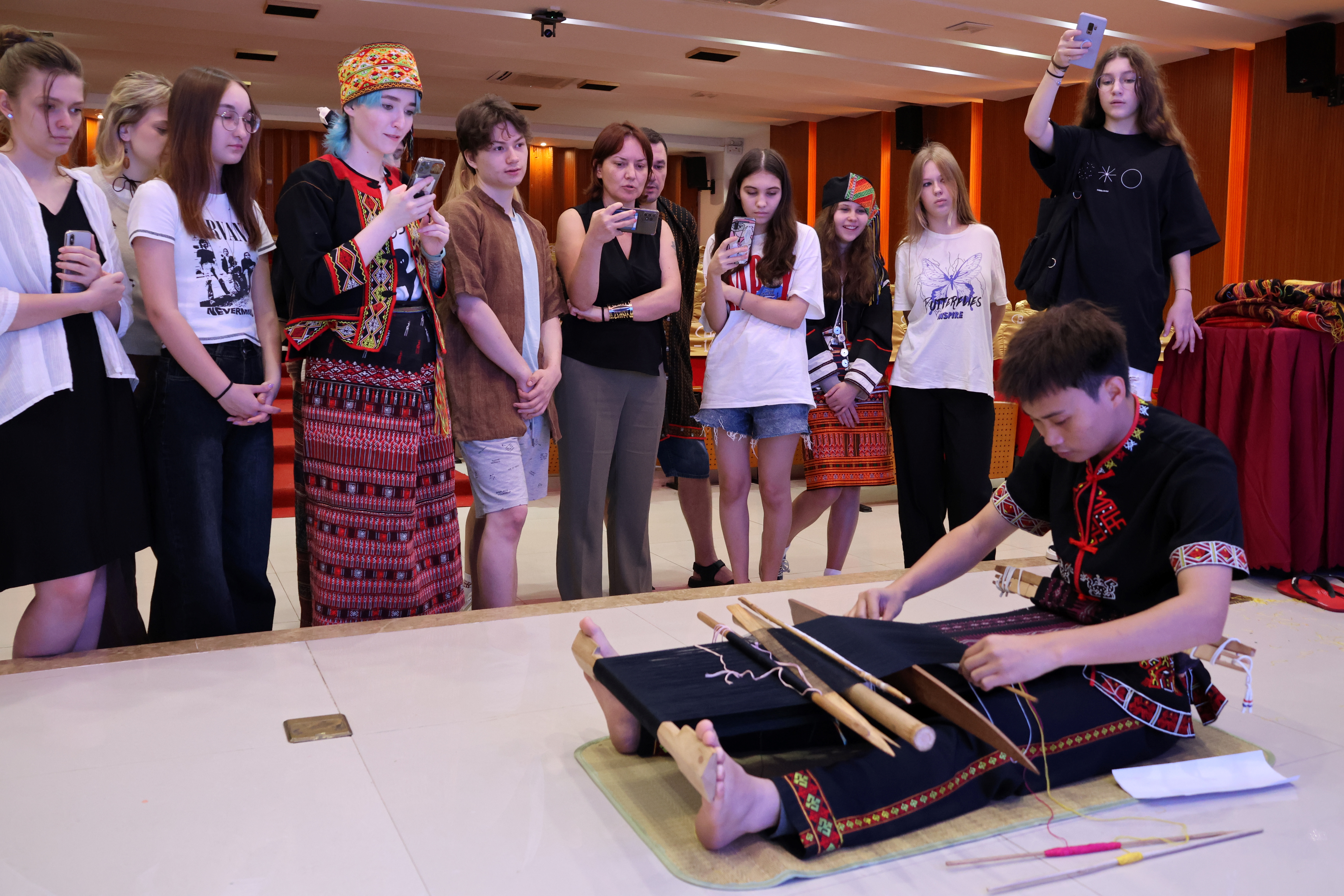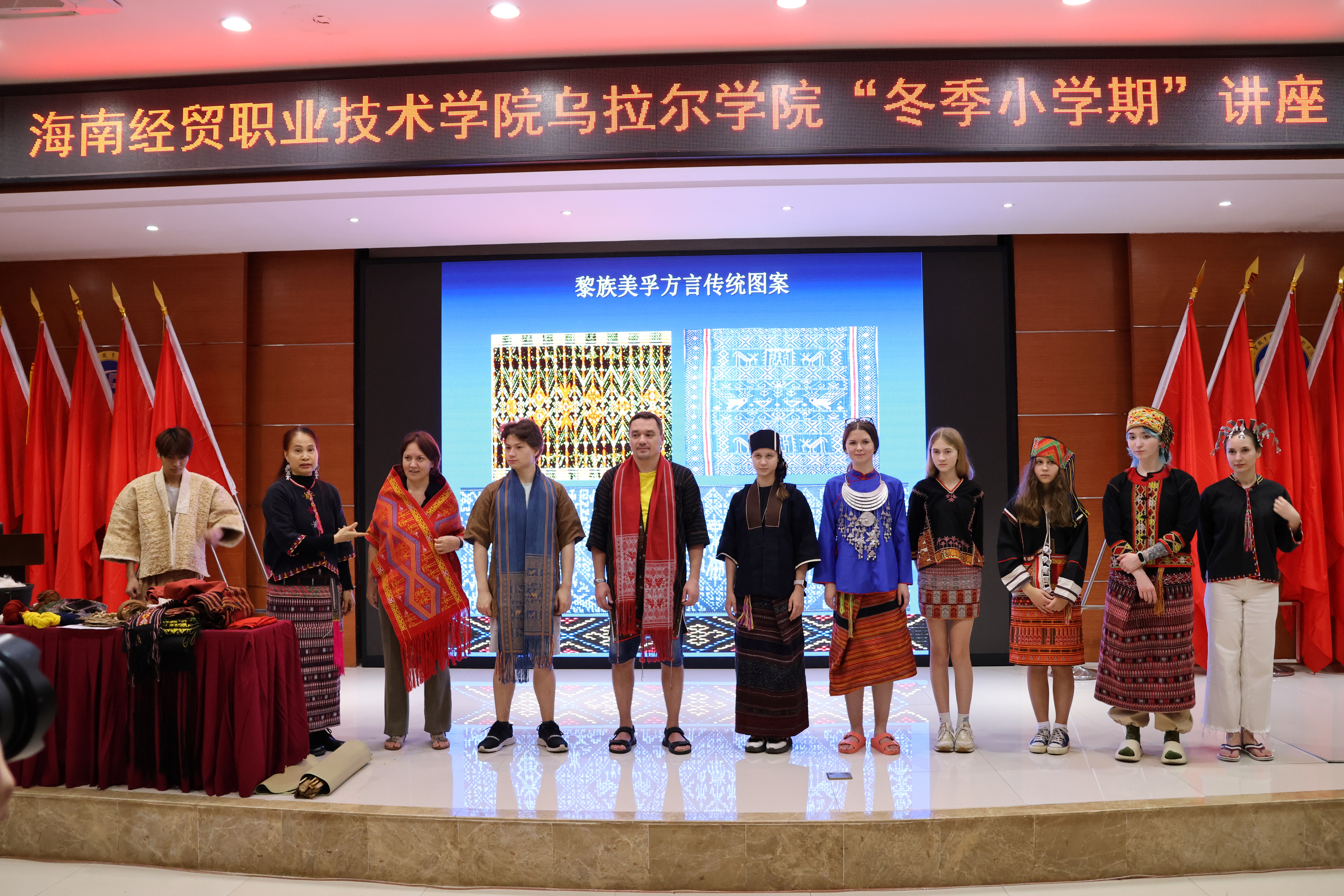活动中,海南省非物质文化传承人、南海工匠陈丹老师从黎锦的原材料、纺、染、织、绣技艺、树皮衣、海南黎族五大方言服饰、图案、龙被以及黎锦与现代生活等方面全面的介绍了非遗黎锦文化知识。我校黎锦现代服饰工匠特色班陆少颖同学进行了织锦技艺展示,赢得了国际友人的啧啧称赞和阵阵掌声。国际学员们穿上海南黎族民族服饰,体验非遗技艺,感受到了海南非遗黎锦服饰文化、精湛的技艺和深厚的文化底蕴。