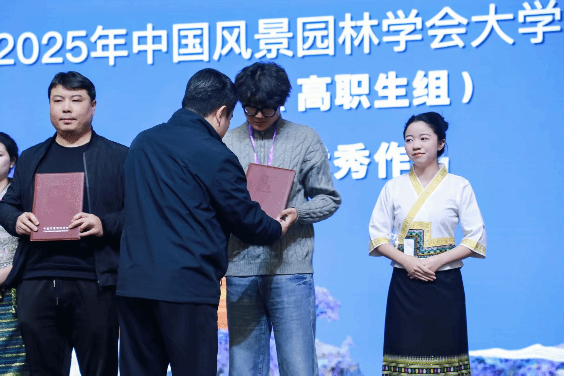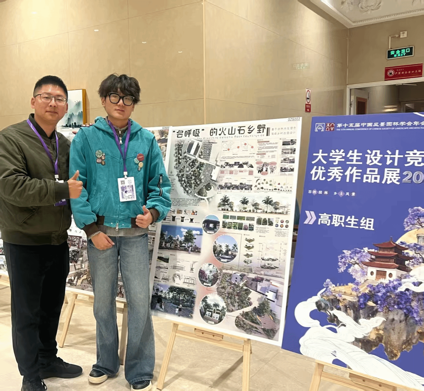 2025年中国风景园林学会大学生设计竞赛由全国一级学会——中国风景园林学会主办,云南省园林行业协会、西南林业大学、昆明理工大学承办,竞赛分设本科生组、研究生组和高职生组。自 2024 年首次增设高职生组后,今年已迎来该组别第二届赛事,经过评审委员会评审,高职生组评选出杰出作品2份、卓越作品4份、荣誉作品6份,我院学生团队排名位列第7。