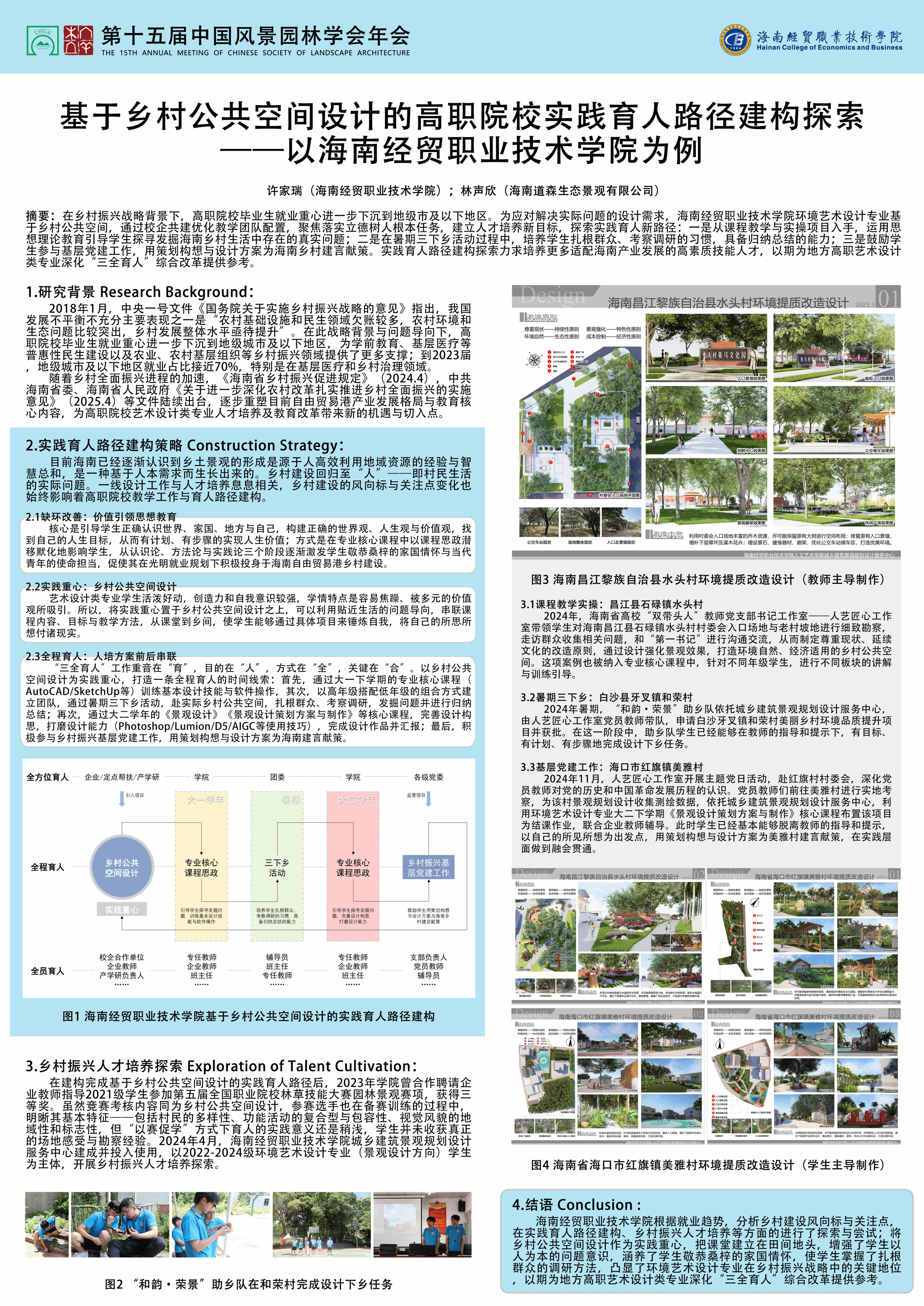 许家瑞老师提交的学术论文《基于乡村公共空间设计的高职院校实践育人路径建构探索——以海南经贸职业技术学院为例》成功入选年会墙报交流展示,展现了环境艺术设计专业在景观领域的教研实力与实践所得。在许家瑞、胡晓两位老师的悉心指导下,23级环境艺术设计专业(景观方向)学生程鹏宇、张彩莲、李红萍、孔维俊杰、潘香梅组成的团队,提交的大学生设计竞赛作品《会呼吸的火山石乡野——基于自然共生理念海南乡村改造设计》斩获高职组荣誉作品称号。这一成绩不仅彰显了经贸学子扎实的专业技能与创新设计思维,更体现了海南在该赛项高职组的持续耕耘态势。
